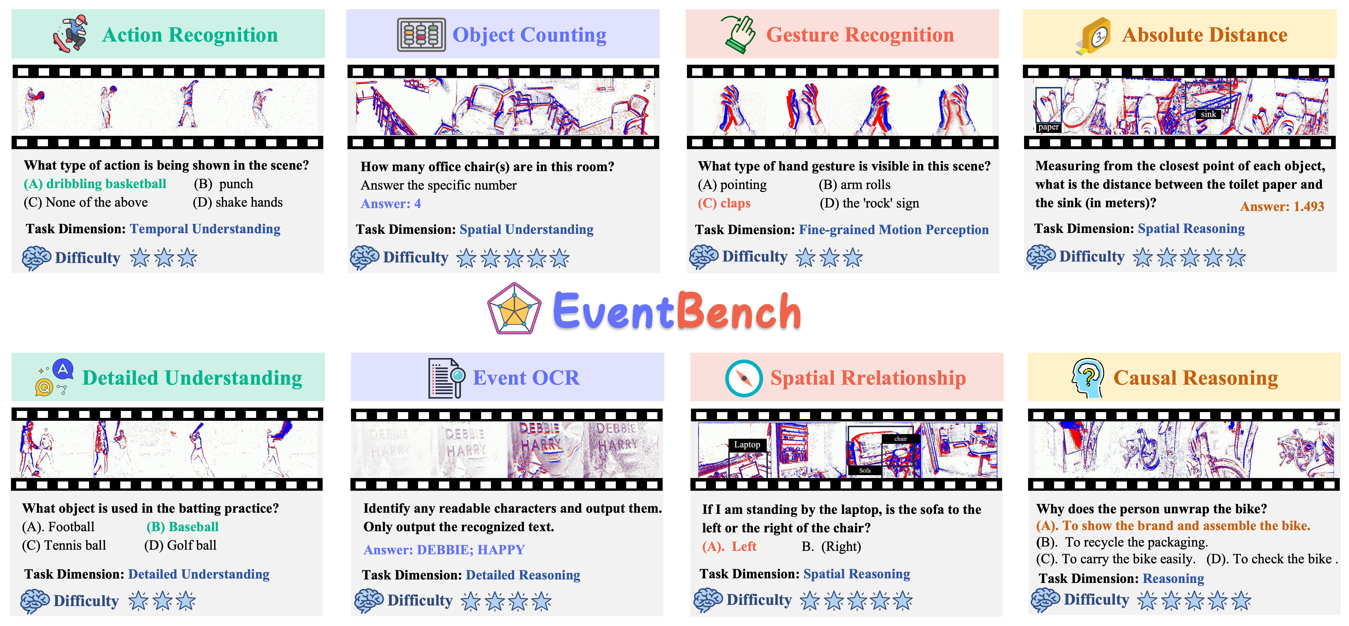 The comprehensive EventBench covers 8 diverse task metrics for systematically evaluating the capabilities of event-based MLLMs. These metrics can be broadly categorized into three types: understanding (detailed understanding, casual reasoning), recognition (action recognition, gesture recognition, and event OCR), and spatial reasoning (spatial relationship, absolute distance, and object counting).